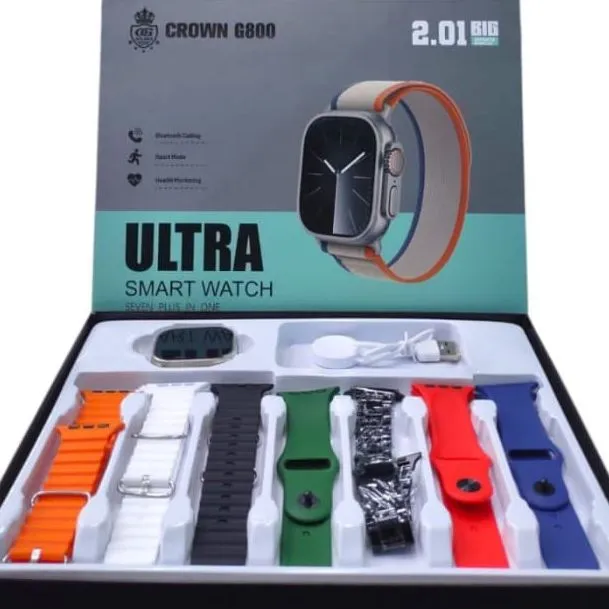 In summary, the image effectively showcases the CROWN G800 ULTRA SMART WATCH and its features, highlighting its sleek design and versatility with interchangeable straps. The advertisement aims to appeal to potential customers by emphasizing the watch's advanced features and stylish appearance.